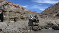 После завтрака едем до переправы через Занскар. Это еще тот атракцион! Небольшой, кое как сколоченный из досок ящик прикреплен блоком к натянутому через Занскар стальному тросу. Привод ручной, так что проверяем уровень своей физической подготовки.